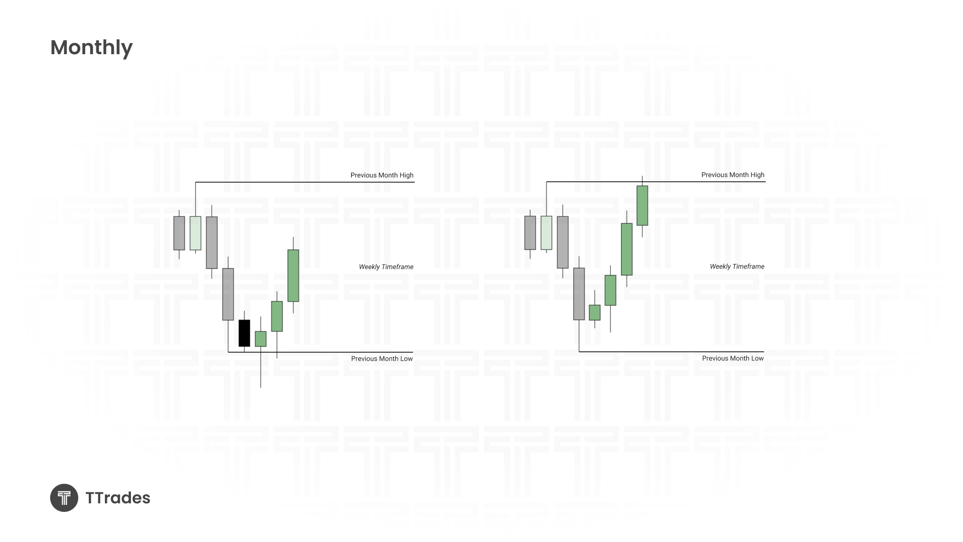 Price often reaches a previous month’s low and reacts or reverses, reaches a previous month’s high before rejecting or continuing, or uses these levels to define the next month’s range. Unless price is consolidating, it is typically seeking one side of the prior month’s range.