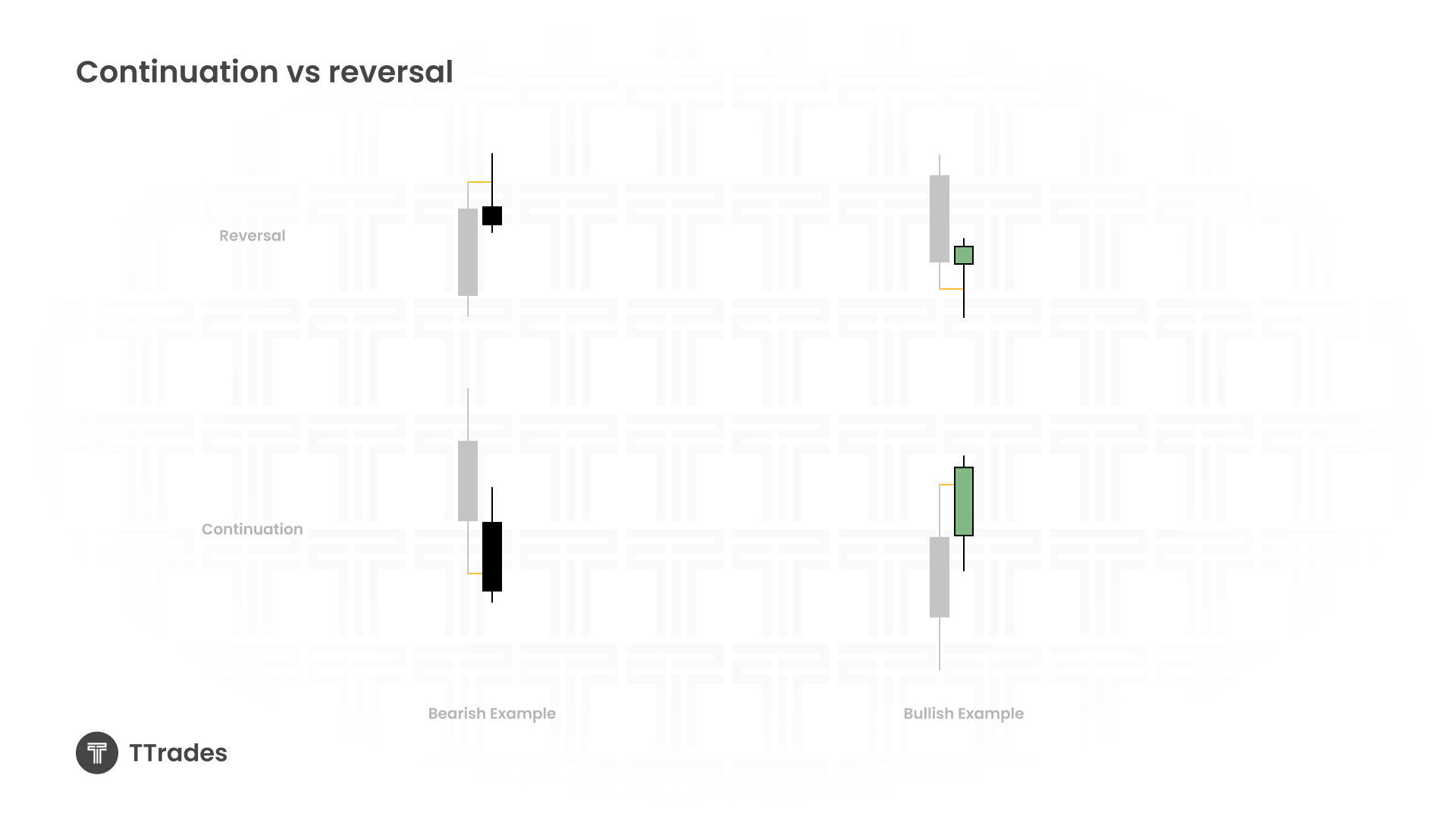 Continuation: Price sweeps the previous candle’s high or low, then closes outside the range.