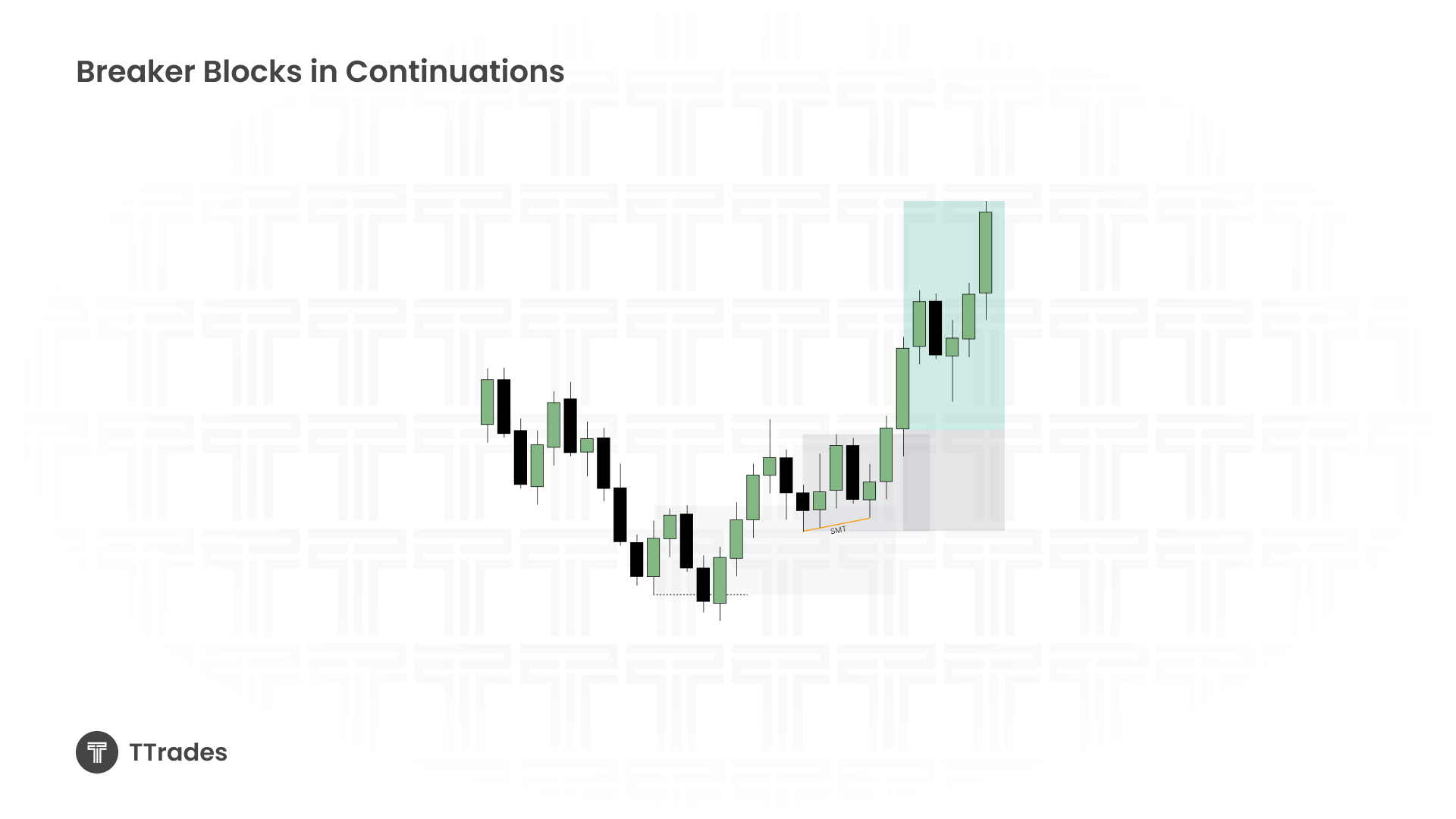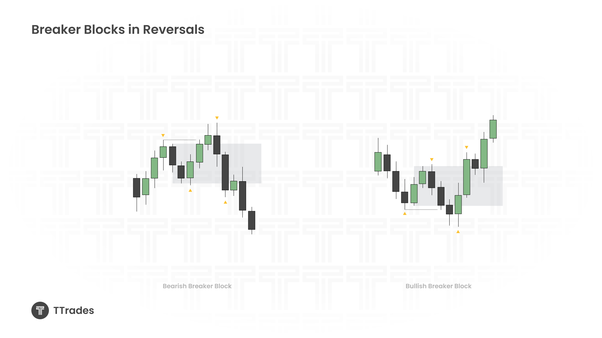 Most traders look for breakers at market reversals, where a trend shifts from bearish to bullish or vice versa.