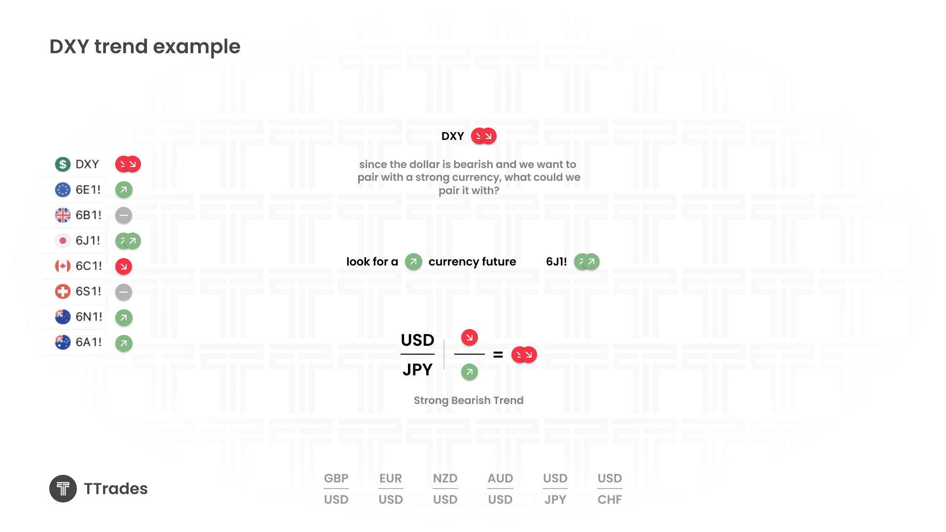 If DXY is trending higher, the dollar is strong. In that case, you want to pair it with the weakest available currency.